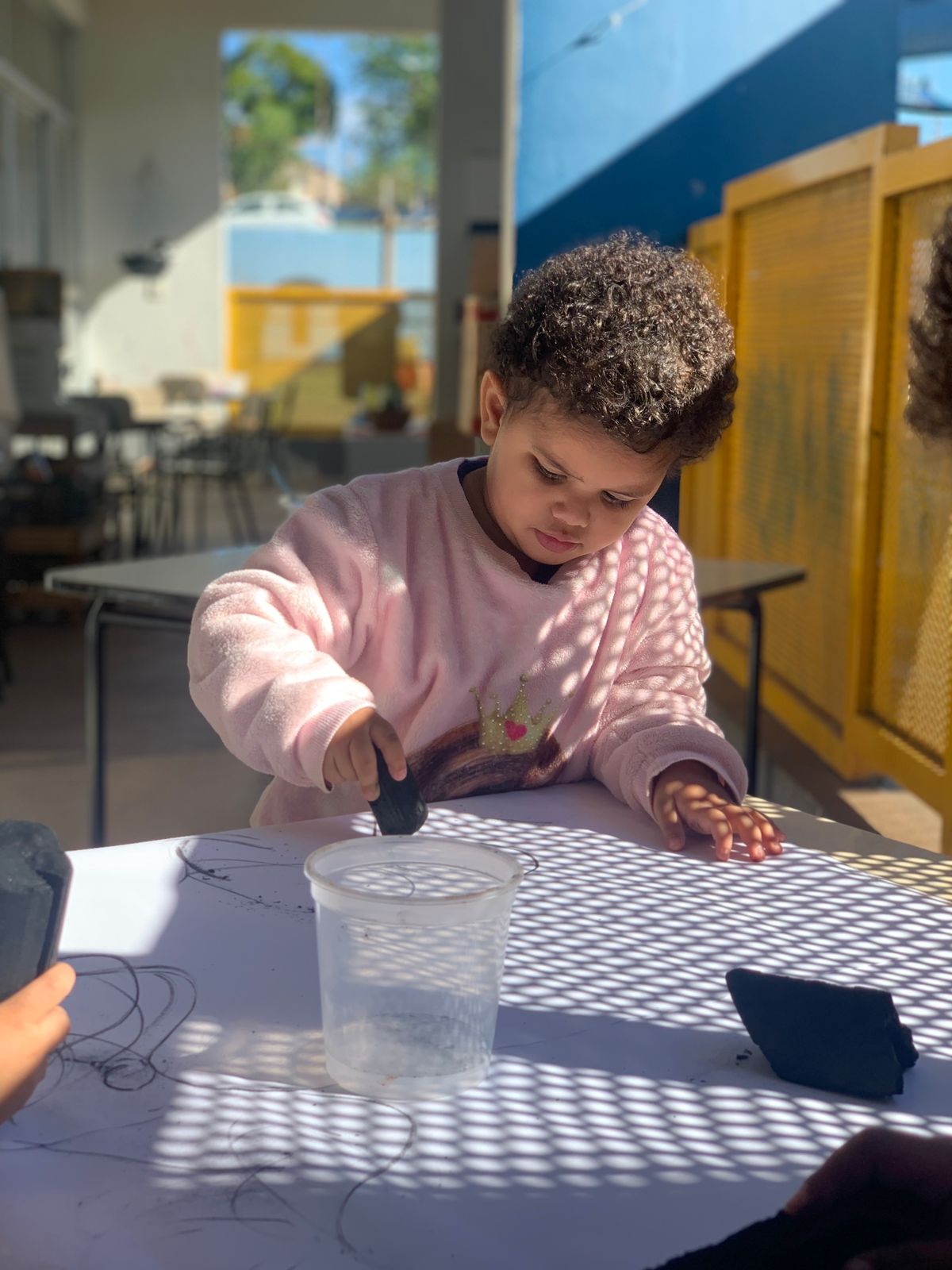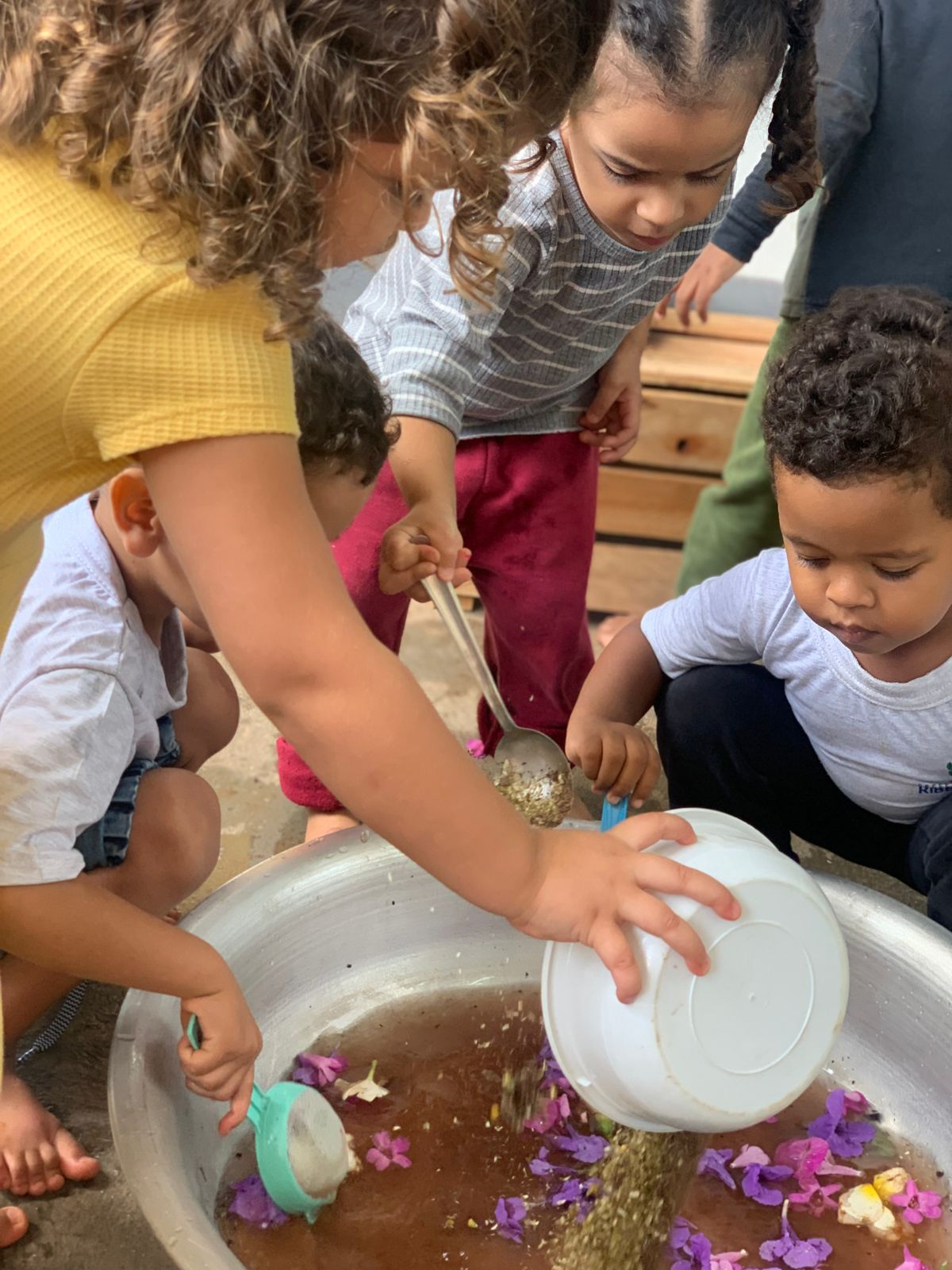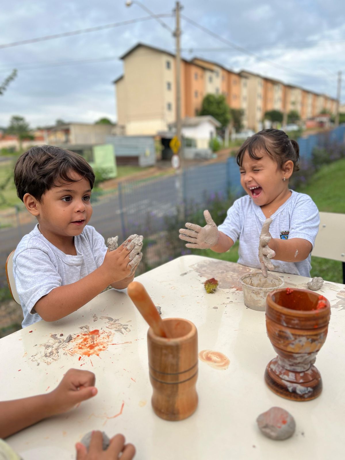 A proposta do projeto norteador também é fortalecida por pedagogias participativas e acolhedoras, que favorecem a escuta ativa das crianças e o protagonismo infantil. Nessa perspectiva, buscamos ampliar as possibilidades de aprendizagem através de materiais não estruturados, que incentivam a imaginação, a criatividade e a exploração livre; o brincar heurístico, que valoriza a curiosidade e o processo de descoberta; as experiências sensoriais com exploração de diferentes alimentos e elementos naturais; uso de tintas naturais, argila, sementes, folhas e outros recursos para atividades artísticas e de investigação.